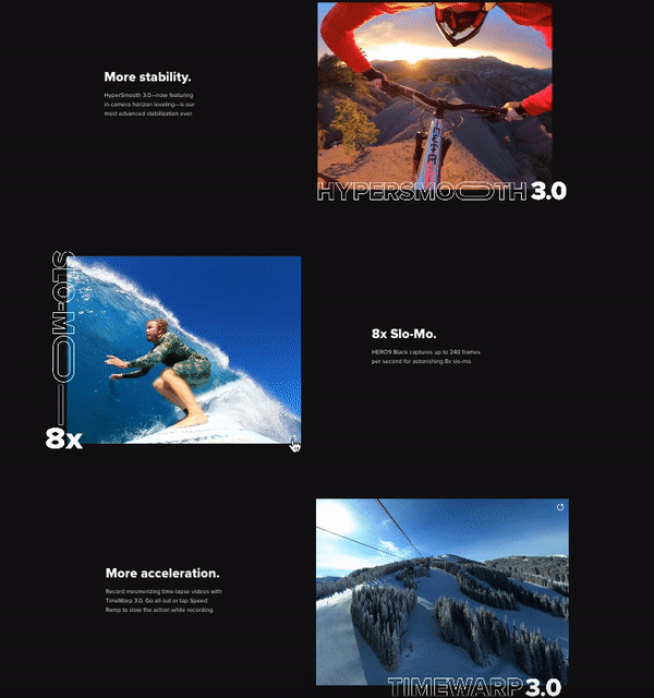 - GoPro: GoPro cameras produce action-packed videos that practically market themselves, which is just what the company has let them do. The website content features rich visuals and immersive videos that sell the adventure-ready cameras easily.