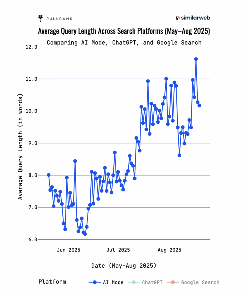 - AI Mode query length trends up (roughly 7–8 words in May to 10–11+ in August). ChatGPT stays near ~70.