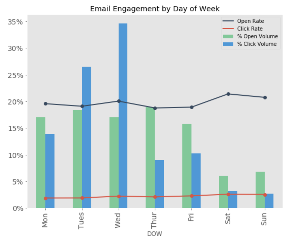 When discussing the day and time you reach out to a prospect, there is some helpful data to support when is the best time to reach out to a client. The graphs below show that click volume is highest on Tuesdays and Wednesdays. Furthermore, open and click volume seems to be the highest for emails sent at 10 AM and 3-4 PM.