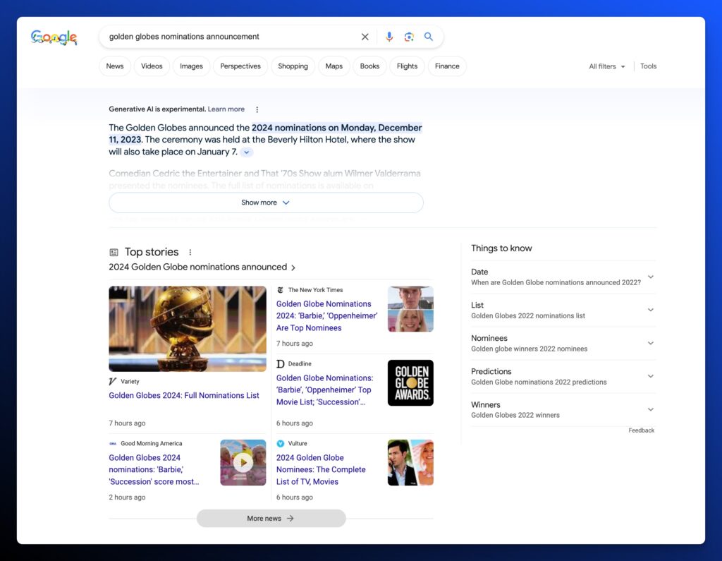 Google has been expanding its footprint in search results for a long time — taking more real estate for itself around major news events (see: 2023 Golden Globes nominations. Easy content – the Winners & Nominees file – is now easily accessible in search results). With SGE, Google is likely to take even more ground for itself – but that’s nothing new. And it shouldn’t be a huge, existential concern for outlets. Instead, publishers should take SGE as an opportunity to reflect on the value they can add for readers on queries where Google is likely to serve a generative experience. How can you create content that does something or provides value to readers that Google cannot? Yes, Google will invariably encroach on your traffic – but take stock of the clicks you’re losing. Are they readers who stick around? Or are they sugar-rush page views? Can you shift focus to the queries and questions Google can’t answer?