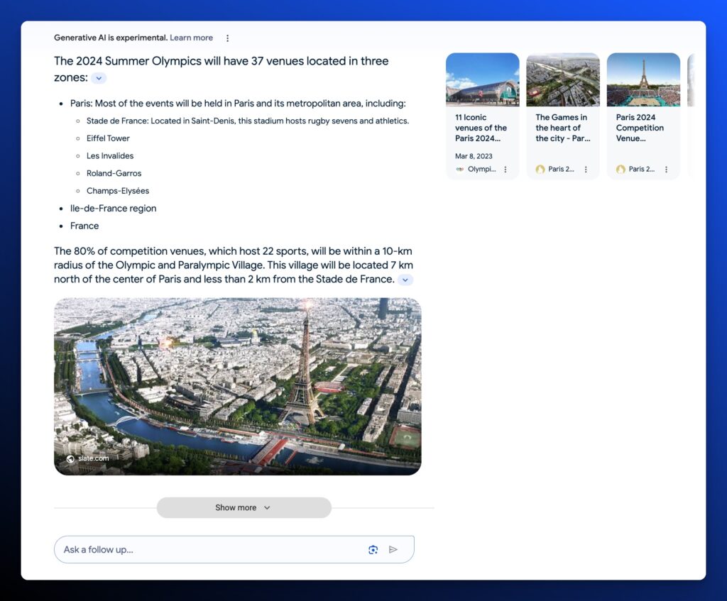 - Constant State of Change: Google is rapidly iterating the results and the way it’s triggered. Since its release in May, Google has added citations within the generated text to attributed articles.