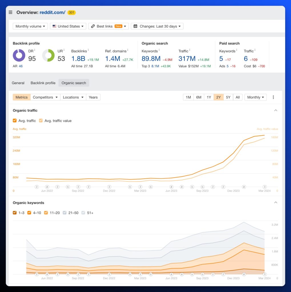 Reddit’s organic search visibility has been skyrocketing since June of 2023. From ~80M visits to ~500M in 9 months. That’s unprecedented.