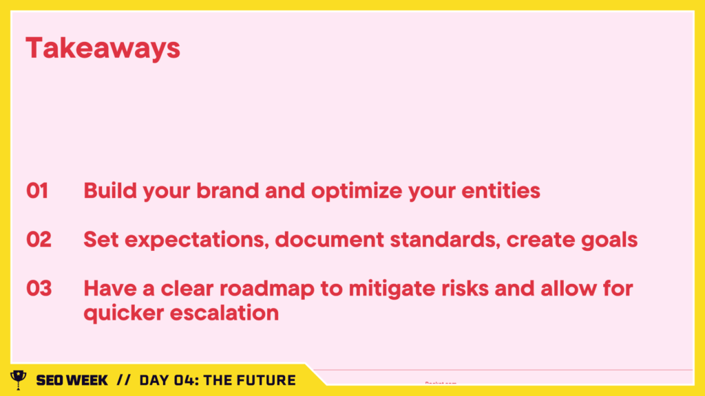 - The Rise of Journey-Based SEO: We’re shifting from keyword and URL optimization to journey and entity-based optimization. SEOs must now identify key entities they want to own, understand user behaviors around those entities, and create content that supports each step in that journey, from initial curiosity to final conversion.