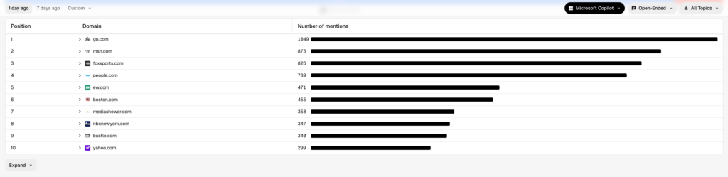 Currently, none of the platforms cited brand websites in their outputs. YouTube was the only channel that a brand might have a direct impact on (and that was explicitly for Perplexity). These results highlight the importance of media publishers for events and the growing value of digital PR in conversational search platform visibility. Strategically embedding Super Bowl-related content into partnerships and press releases timed around major events could boost citation rates, but leveraging the media is your best direction.