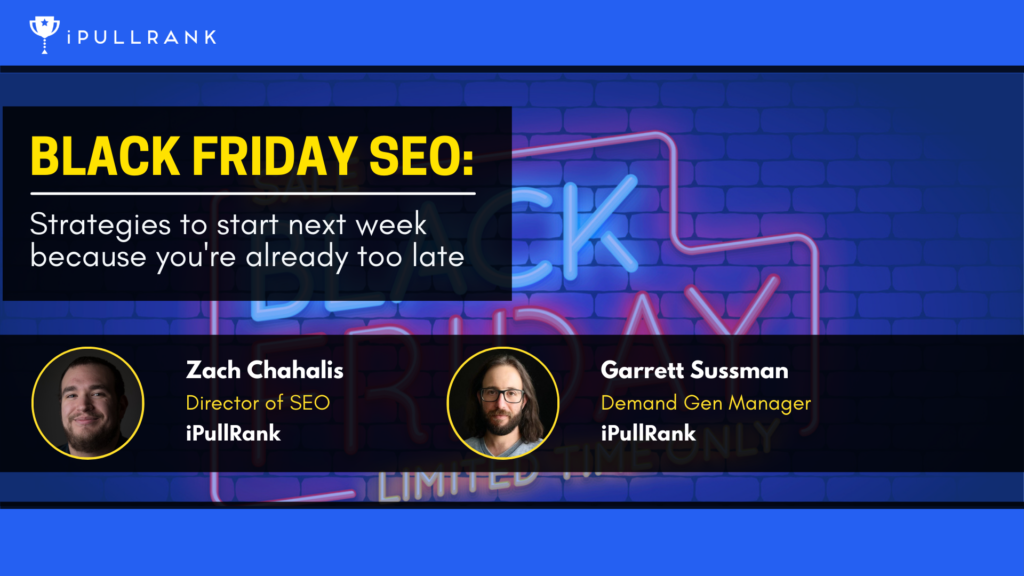 In this webinar, Zach Chahalis and Garrett Sussman of iPullRank cover a step-by-step walkthrough of the actions you need to be taking to prepare your business for Black Friday.