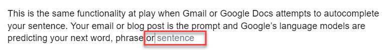 This is the same functionality at play when Gmail or Google Docs attempts to autocomplete your sentence. The email or document is the prompt and Google’s language models are predicting your next word, phrase, or response as you write. Note: I suspect that it will be a bit discombobulating to see a portion of the same paragraph in the screenshot above, so I’m just writing an additional sentence to make this area visually easier to differentiate so readers don’t think it was a mistake.