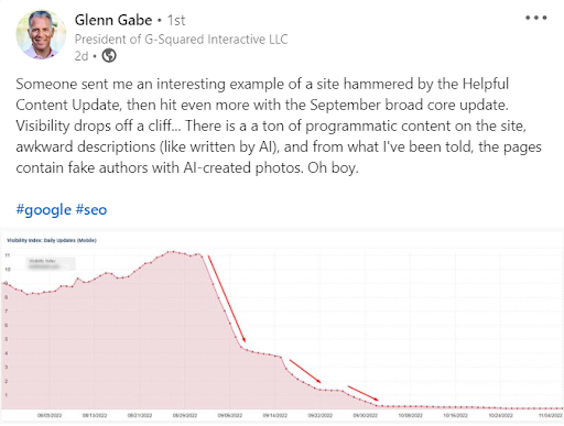 However we’re currently in a space where whenever there is a shift in visibility for a site there is a lot of speculation in the echo chamber that this is the moment that Google has dropped the hammer on “AI-created content.” For instance, writers using the pen name “Neil Patel” have indicated that their sites with “AI content” sustained losses in the Spam update.