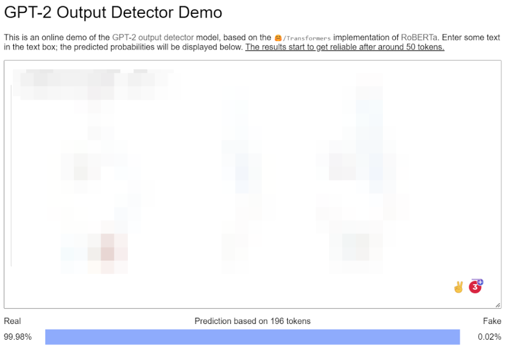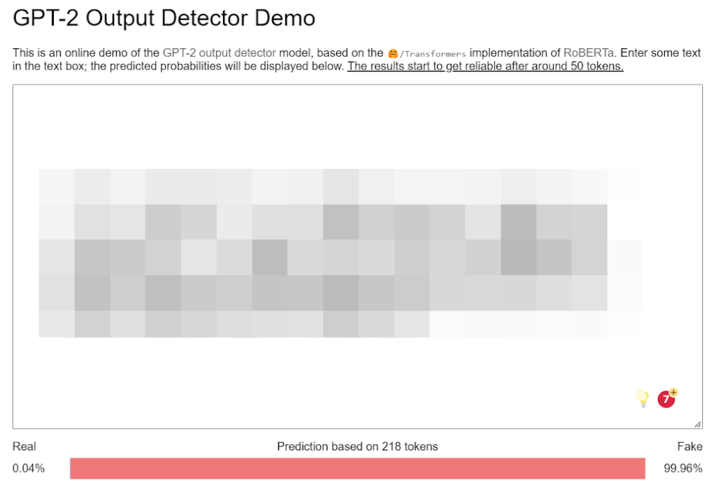As of this writing, there are three open-source projects that I’m aware of that attempt to detect generated content. Grover, a fake news detector, GLTR, and the GPT-2 Output Detector built from RoBERTa.