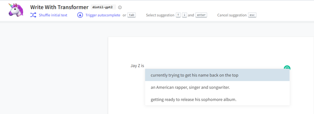 In this screenshot, you’re seeing the three different directions that the model feels confident about taking a sentence that starts with “Jay Z is.” The longer it goes further unprompted the more it will begin to meander into topics of disinterest.