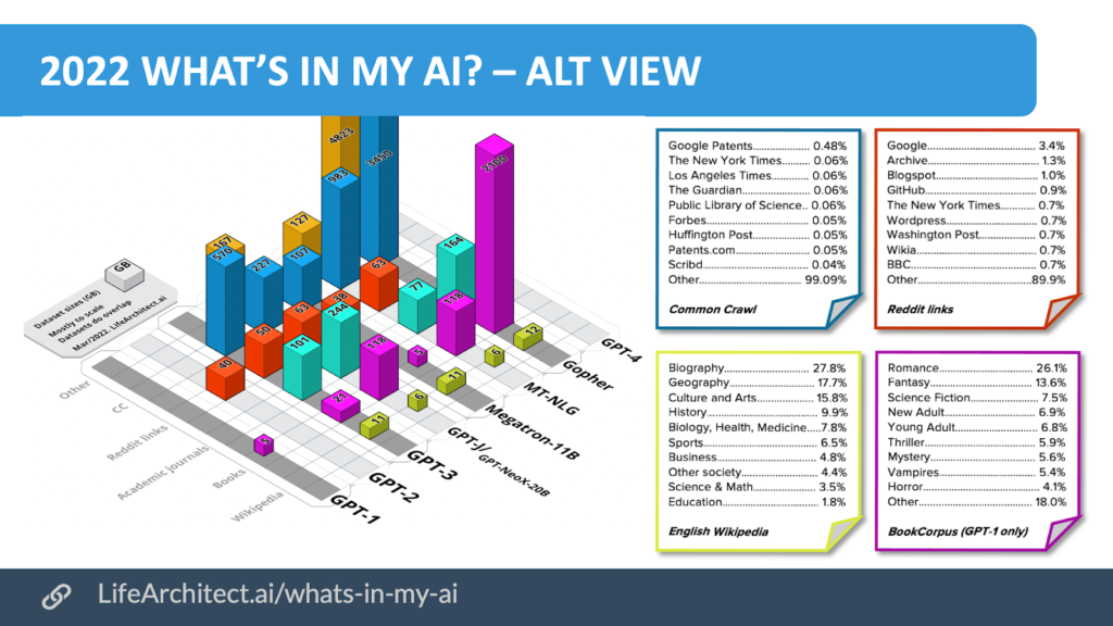 When I say that these language models are trained from colossal collections of documents, I mean that the engineers building them take huge publicly available data stores from well-known corpora such as the Common Crawl, Wikipedia, the Internet Archive as well as WordPress, Blogspot (aka Spam City), New York Times, eBay, GitHub, CNN and (yikes) Reddit among other sources.