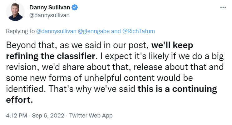 Although Google spokespeople are deferring to their broadly binary (no pun) guideline related to “machine created content,” I don’t believe that Google is sitting idly while an explosion of LLMs and AI writing tools happens. My guess is that the Helpful Content update was the initial rollout of a new classifier that is seeking to solve a series of problems related to content utility. Much like Panda before it, I suspect Google is testing and learning and, as Danny Sullivan indicates below, they will continue to refine their efforts.