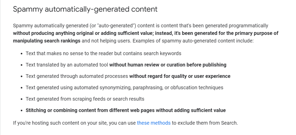 Much of what I’ve classified as “utility content” could fall under this definition, but if you’re going to create such content, you should be doing it with the rare user who will actually read it in mind rather than just for a search engine. Bullets two and three should naturally be covered by your site’s editorial requirements. Really, it’s the last bullet that places the output of a large language model technically in question. After all, conceptually, a large language model is just stitching or combining words based on what it’s learned from other websites, but again, your editorial guidance should ensure that sufficient value is added.