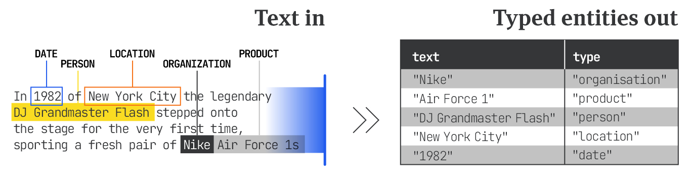 Named Entity Recognition (NER) is the process of extracting named entities from unstructured text. The text is scanned and the software labels terms that align with its database of entities, with broad types like Person, Organization, Product, Location, Date, and so on. Entity recognition as a process turns unstructured copy into structured fragments a program can reason about.