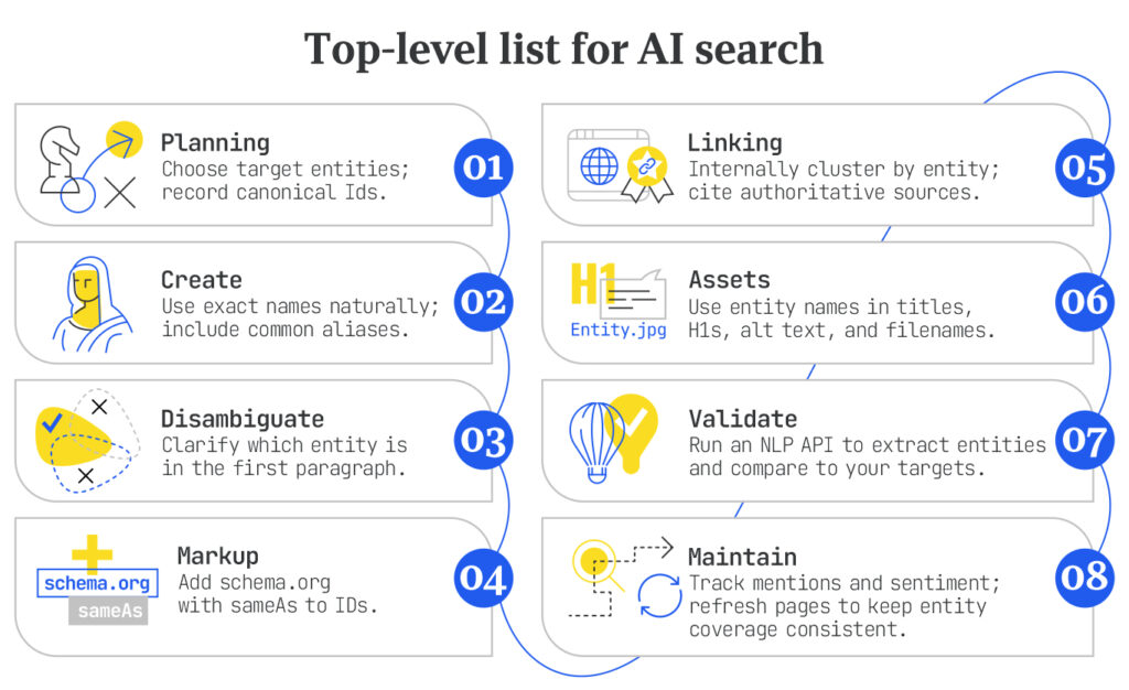 - Assets: Use entity names in titles, H1s, alt text, and filenames.