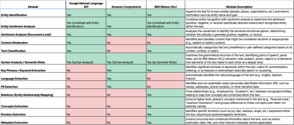 In repeated experiments I ran, task-specific cloud NLP APIs consistently returned more entities, richer metadata, and reproducible outputs than generative AI chatbots and LLMs. Google Cloud Natural Language (clear winner in total and unique entities) returns entity type, mentions, sentiment, and crucially metadata like Wikipedia URLs and Google Knowledge Graph IDs. AWS Comprehend performs solidly on entities and adds a dedicated Key Phrases module (often surfacing concepts Google catalogs as ‘Other’ entities). IBM Watson NLU contributes relationship graphs and emotion signals alongside entity sentiment. If you insist on using a chatbot, DeepSeek R1 fared best among LLMs tested, but variability and weaker structure remain. LLMs are simply poor fits for production entity pipelines.