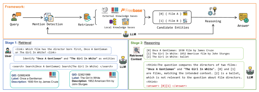 Document Retrieval and Synthesis (RAG) | Find entity mentions in docs/passages to form a custom corpus. | Do passage-level matching; embed queries/subqueries/docs/passages; select passages that support reasoning steps; route to downstream LLMs by query class. | Bias retrieval with type constraints and KG proximity; ensure content is entity-rich/KG-aligned. | Normalise variant names so the same entity is retrieved despite surface differences. | Candidate corpus (dense+sparse); passage embeddings and scores; retrieval logs; LLM routing decision. |