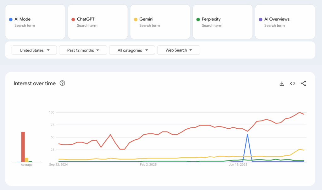 Despite all the announcements and updates, people still don’t seem to care about AI Mode. According to Google Trends data (August 2024–August 2025), “AI Mode” has one blip on the radar during the week of June 29–July 5, likely tied to the announcement of deep search and model switching capabilities via their blog.