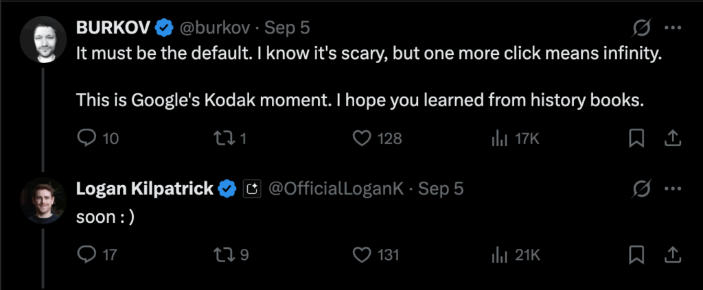 September 5 – Logan Kilpatrick replied “Soon” to a post pushing for AI Mode to be the default version of search after an announcement that Google had created google.com/ai as a direct straight to the AI Mode interface destination. Momentum looked real.