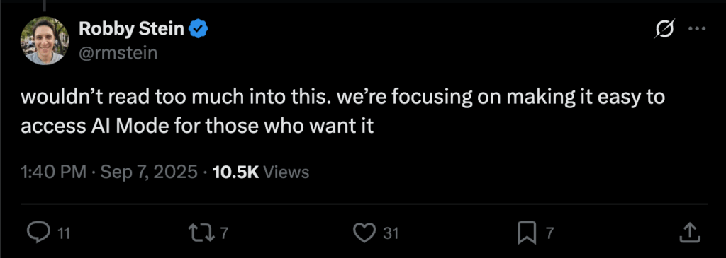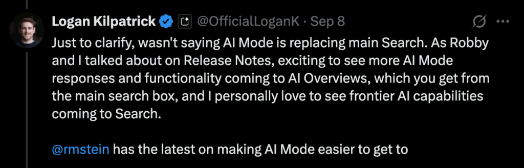 September 7-8 – Then came the soft pedal. Robby Stein says not to read too much into “soon,” framing the near-term focus as easier access for people who want AI Mode, not a hard switch to default. A day later, Kilpatrick backed that and clarified he was not saying AI Mode replaces main Search right now. Signal remains. Timeline stays murky.