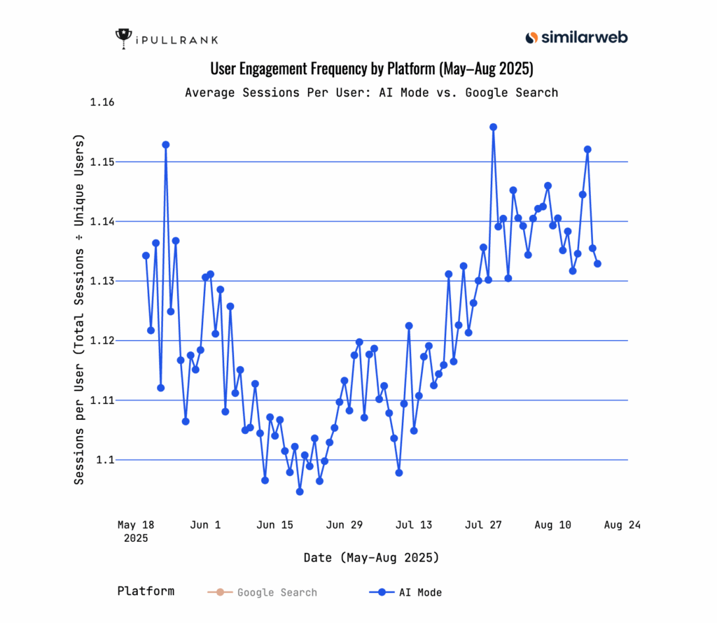 Google Search stays steady at about 2.6 to 2.7 sessions per user through the period. AI Mode sits much lower at about 1.1 to 1.15 sessions per user but shows a clear rebound starting in July after an early summer dip.