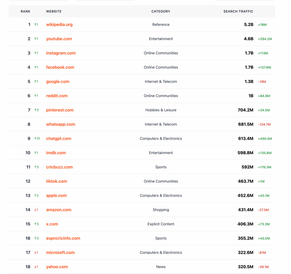 Developer sites surprisingly punch above their weight. GitHub, Stack Overflow, and Stack Exchange appear often, hinting at early-adopter skew and task types like troubleshooting.