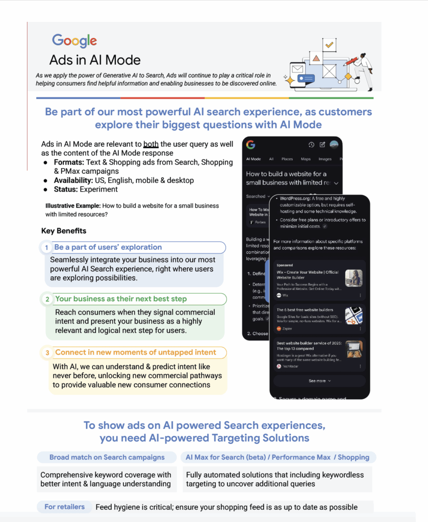 August 4 – The Google sales team is lining up AI Mode Ads for aggressive Q4 testing. Shout out to Anu Adegbola for the scoop. Agencies were briefed in early August on conversation-level targeting inside AI Mode. If those units perform, the case for a default or quasi-default experience gets stronger because the revenue model travels with it.