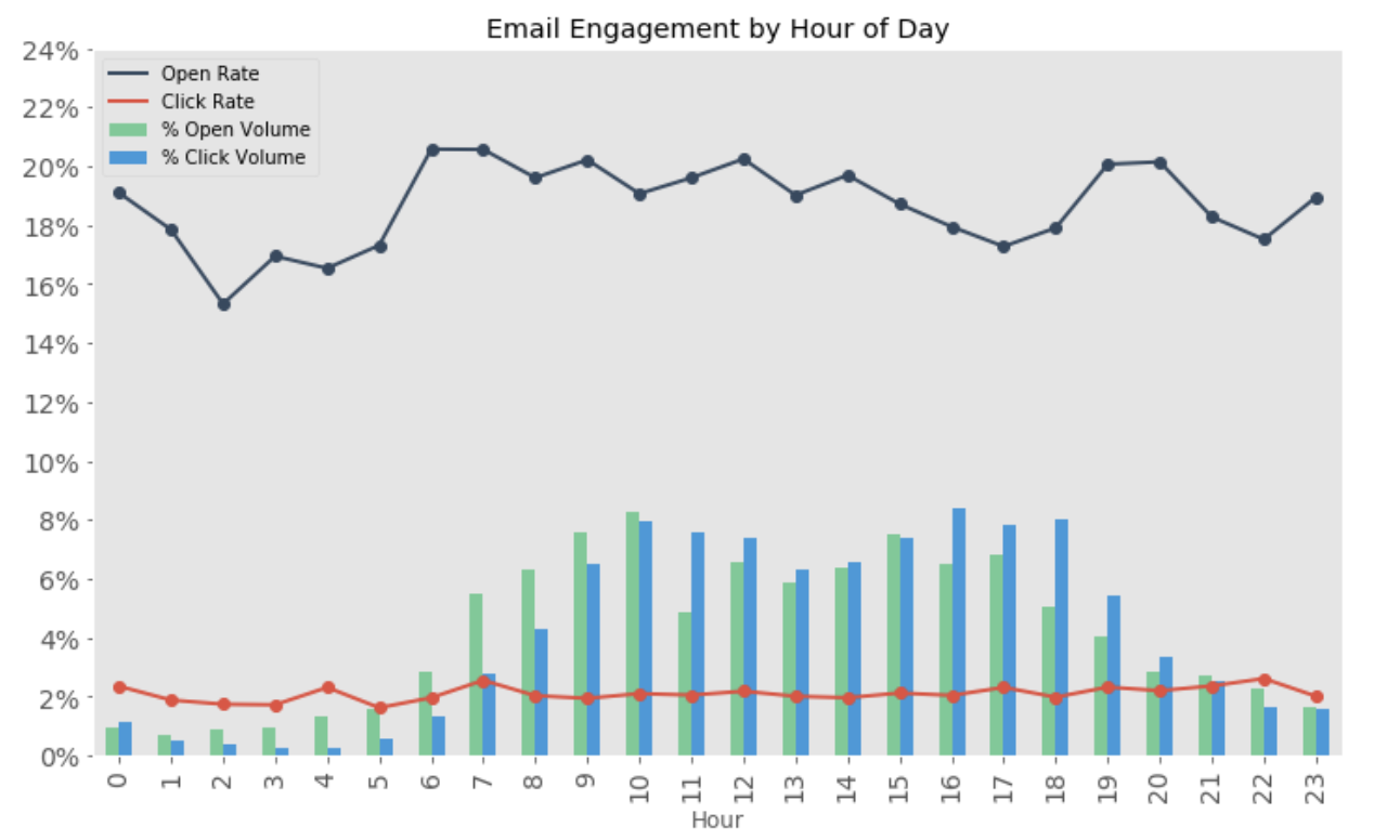When discussing the day and time you reach out to a prospect, there is some helpful data to support when is the best time to reach out to a client. The graphs below show that click volume is highest on Tuesdays and Wednesdays. Furthermore, open and click volume seems to be the highest for emails sent at 10 AM and 3-4 PM.