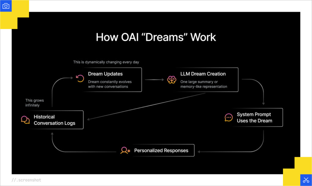 On the technical end, James talked through his team’s hypothesis on how long-term memory works. It sounds as though there’s a representation of all conversations that is constantly updated and added to the system prompt. Presumably, this is some sort of aggregated embedding or another version of the long-term memory store that further informs downstream conversations. As we’ll discuss a few hundred words from here, this aligns with the approach described in Google’s patents.