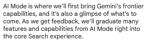 With the announcement of enhancements to AI Mode, literally everything I said is either now live in your Google Search experience or on the way this year. Google has also been warning us since the launch of their AIO and AI Mode explainer doc that the best of AI Mode will ultimately make its way to the core search experience. The more I’ve researched how these features work, the more adamant I’ve become that our space needs to think bigger.