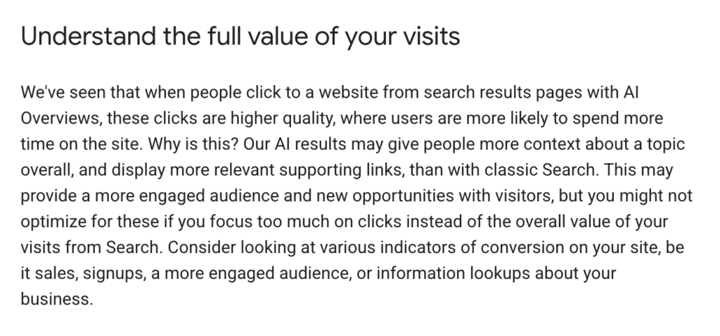 I’d suggested that it would have been helpful to have insights from internal usability studies or some results from the Google Labs tests of AIOs to know search behavior is changing. The engineers seemed surprised to hear how universal the click losses have been. Ultimately, we were told, again, that things are moving so fast and are so volatile that it would have been difficult to provide any data or warnings up front to have helped our community through this process. However, there were allusions that there will be future releases that may help. Since that conversation, we’ve gotten a couple of articles on Search Central that allude to the improved quality of visits from search and direction to stop measuring clicks.