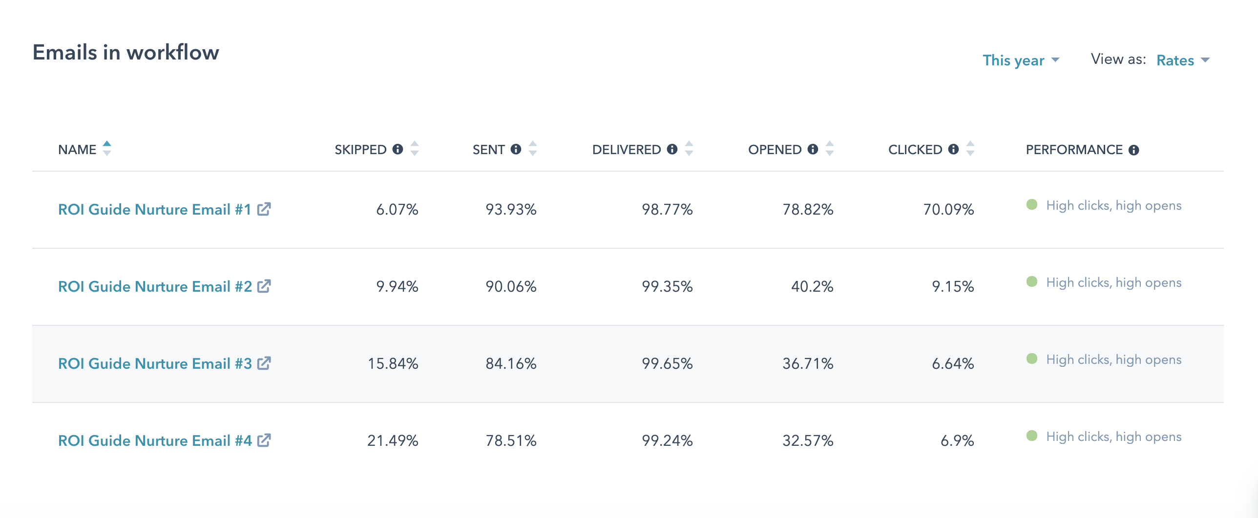 As you can see, the performance of these nurture emails that followed the guide download was outstanding, with open rates and click-through rates well above the industry average (15.8% & 2.4% for marketing agency email campaigns). This just shows how you can turn an engagement, in this case, the download of our ROI guide, into a continuous nurture path that may turn into a potential sale down the road. Again, it’s the long-term win we are looking for.