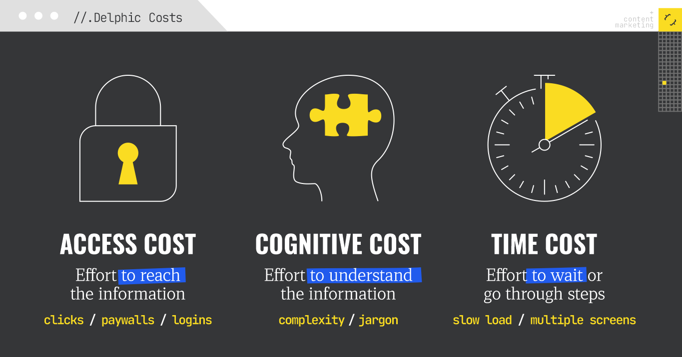 But over time, both user expectations and technology changed. A key paper by Andrei Broder and Preston McAfee of Google Research, “Delphic Costs and Benefits in Web Search,” tells us that there are several non-monetary costs associated with search, including: