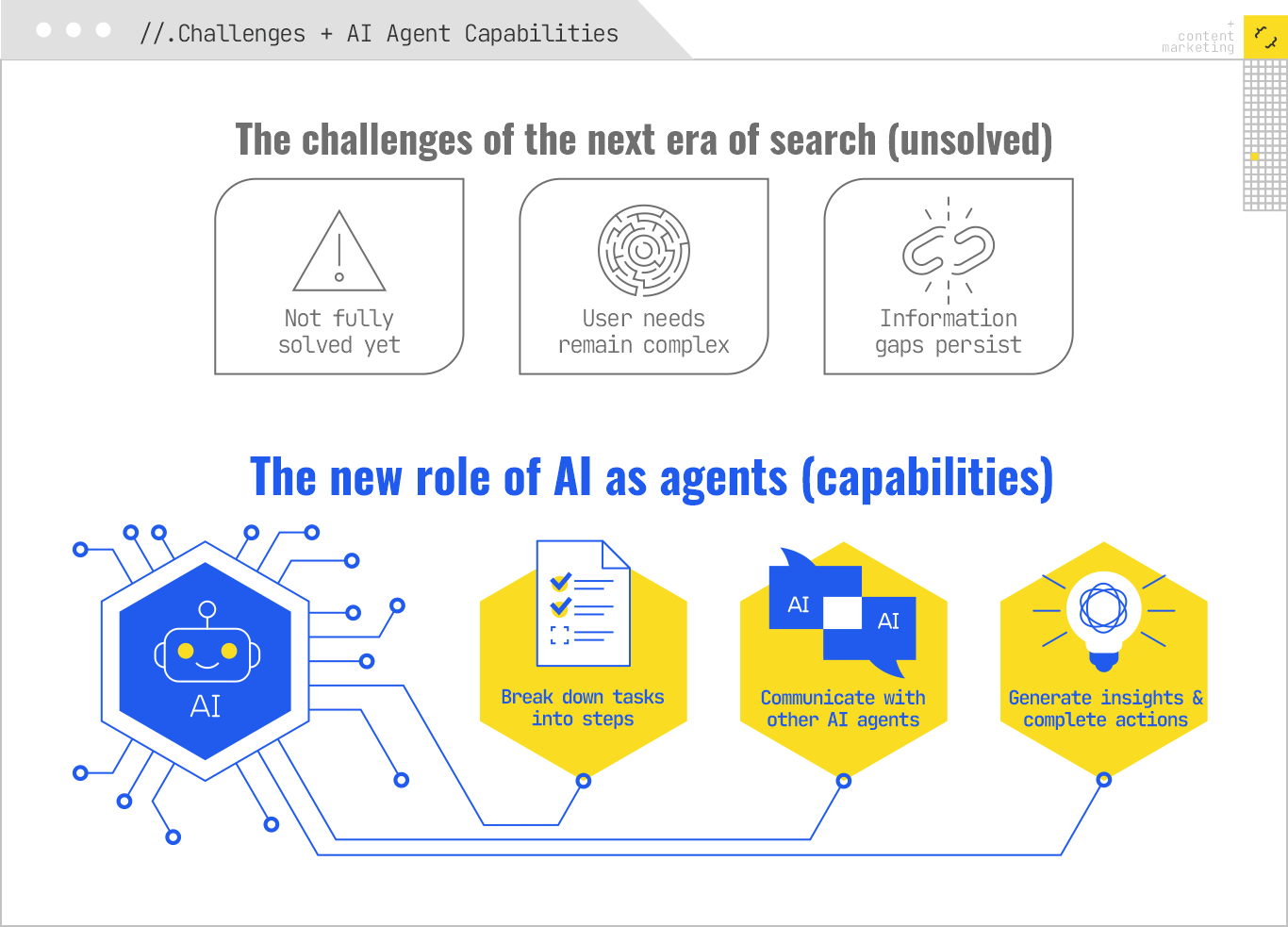 These are the challenges facing the next era of search. And as of today, they’re not fully solved. Plus, the role of AI in search isn’t limited to summarizing answers anymore. We’re entering a phase where generative models act as agents, not just tools, that can: