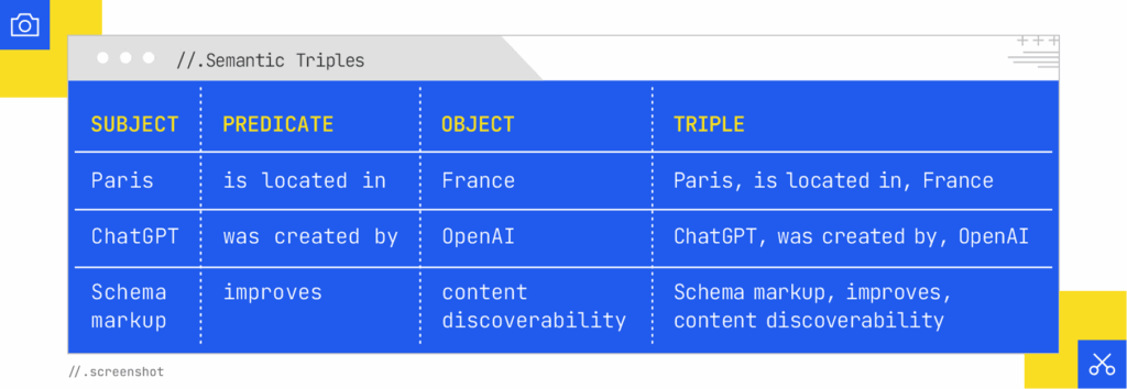 - Semantic/AI-focused site audit: A deep review of your technical, content, and entity signals to pinpoint why models skip you. This goes beyond page speed or title tags and looks at schema, structure, embeddings, and whether your content is aligned with real-world queries and synthetic variations. A key part of this is mapping content into semantic triples (subject → predicate → object), so that AIs can interpret relationships and reuse your passages with confidence.