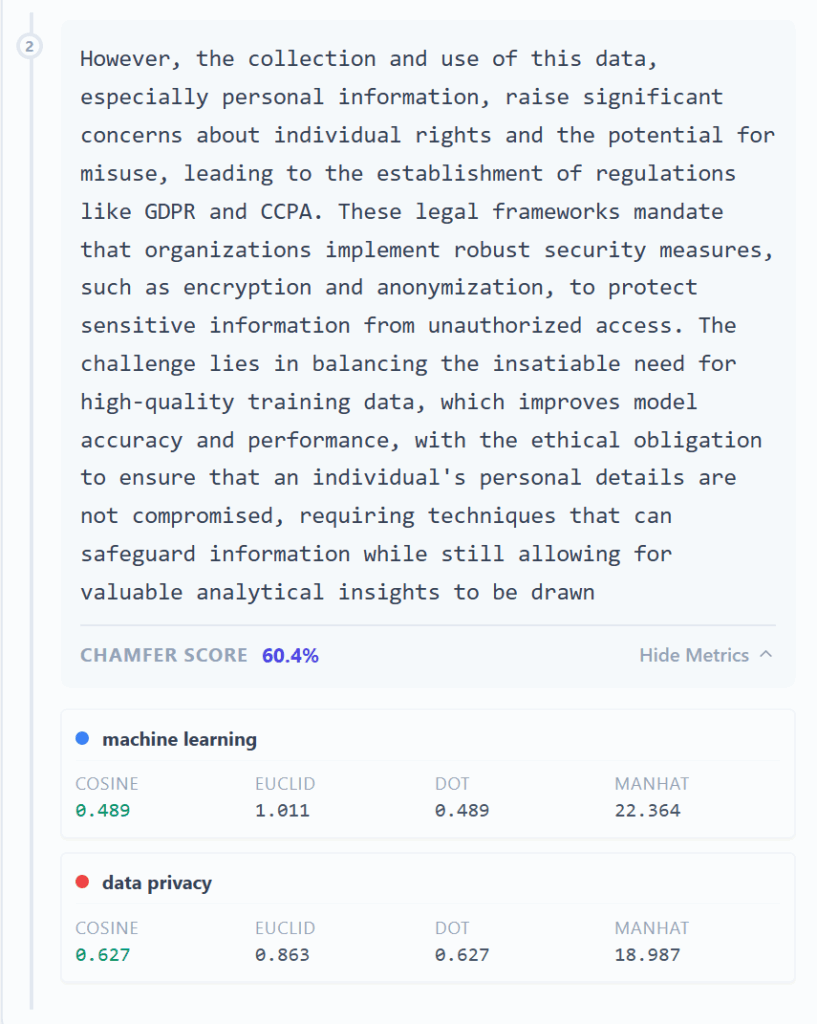 The paragraph above targets the queries [machine learning] and the [data privacy]. When I generate embeddings for the queries and for that paragraph, using cosine similarity as my distance measure I get a 0.541 for [machine learning] and an 0.620 for [data privacy].