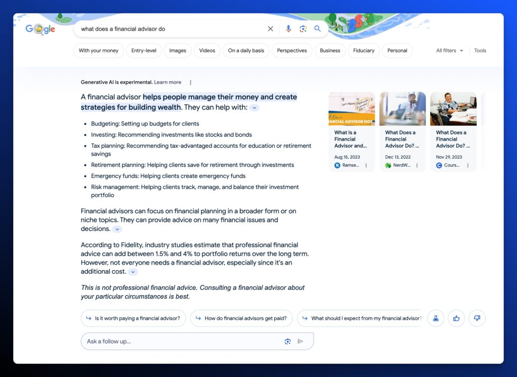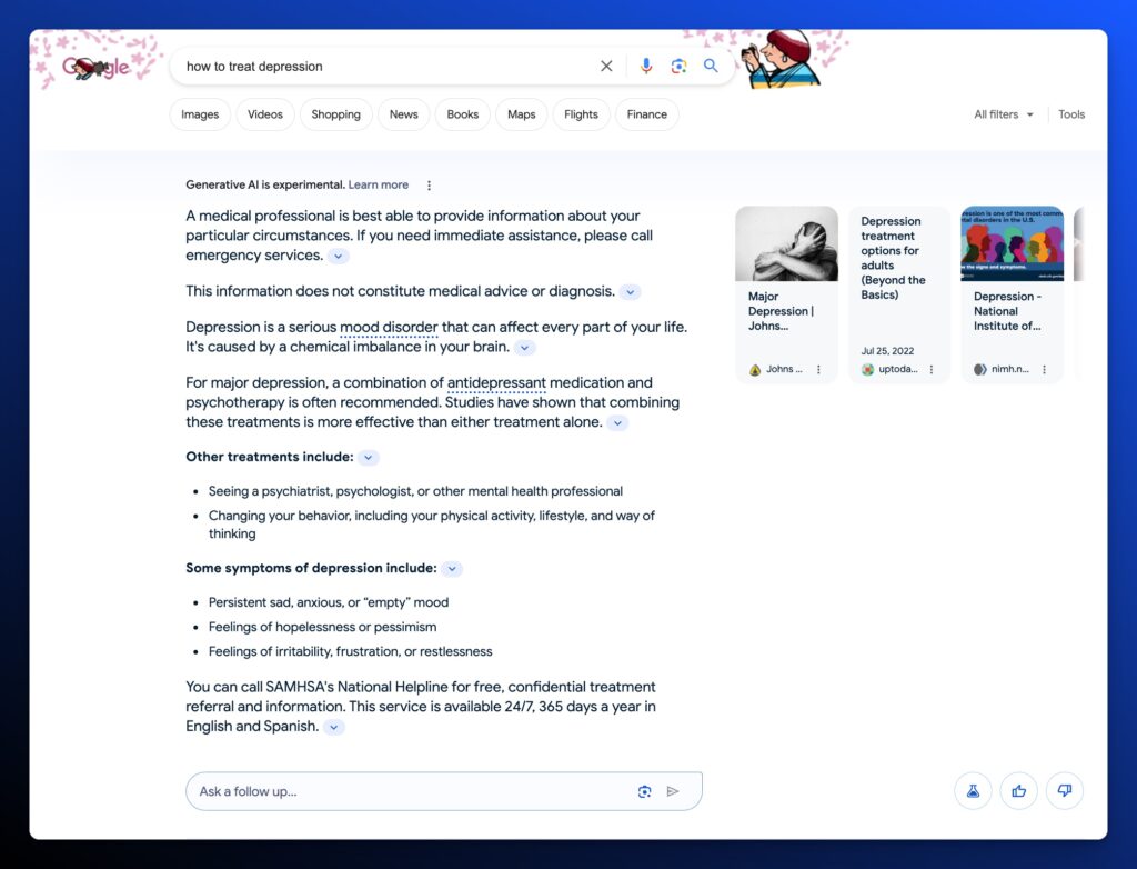 When Google first announced AI Overviews, they implied at the Google I/O keynote that AI Overviews would not appear on Your Money Your Life (YMYL) queries, but that’s not always been the case. Typically these queries fall under financial, health, and political content. But we’ve seen AI Overviews on everything from financial advisor-related queries to how to treat depression.