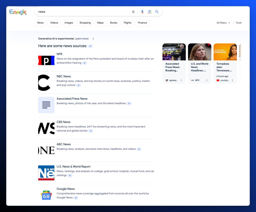 One big and important distinction before we go deeper. As of now, the Search Generative Experience only applies to normal Organic Search. Google News remains unscathed. That massive source of traffic from Google should remain untouched. While Google is capable of anything, to destroy that would be to completely destroy their relationship with the news media.