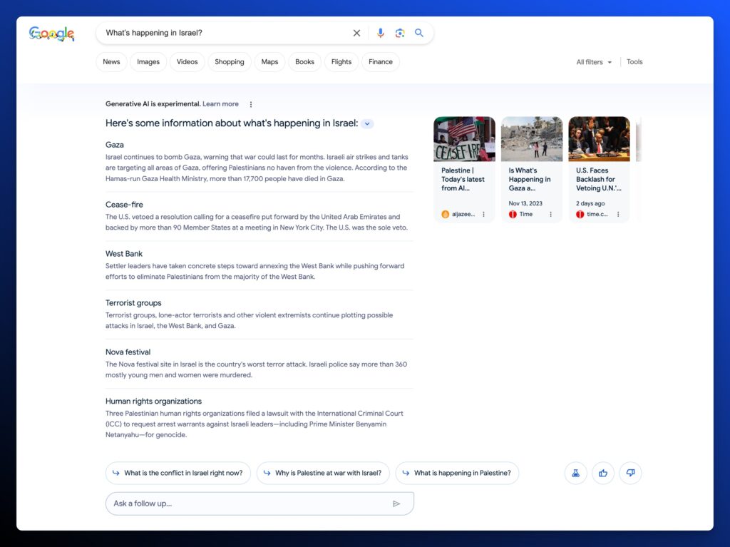 But your SEO team should still manually investigate where it’s appearing. Take for instance the sensitive nature of Israel and Palestine. AI Overviews can be triggered for the query “What’s happening in Israel?”: