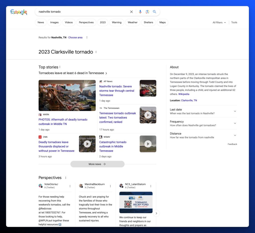 Here’s an example where it doesn’t appear for a recent series of deadly tornados in Tennessee: