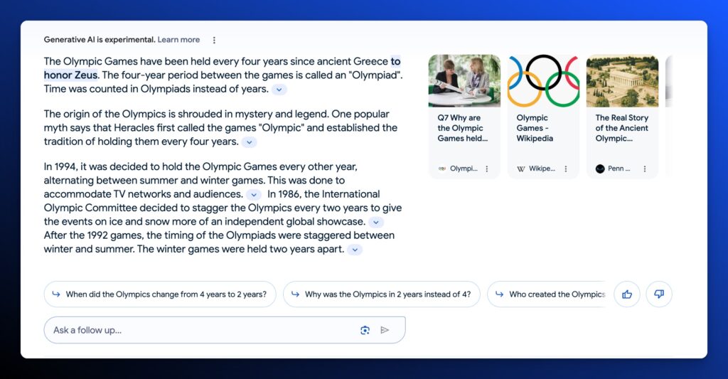 - Constant State of Change: Google is rapidly iterating the results and the way it’s triggered. Since its release in May, Google has added citations within the generated text to attributed articles.