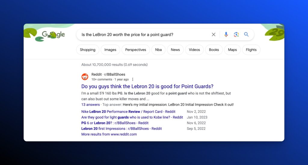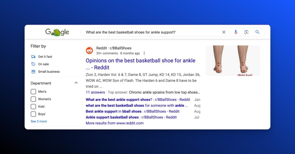 Let’s look at how Reddit might appear in Google search results for queries related to basketball shoes across different stages of the buyer’s journey, using specific examples for each stage: