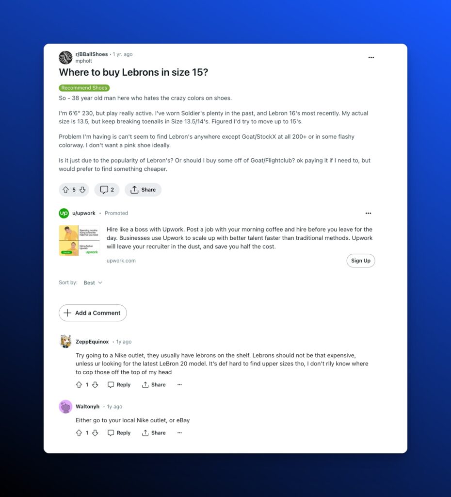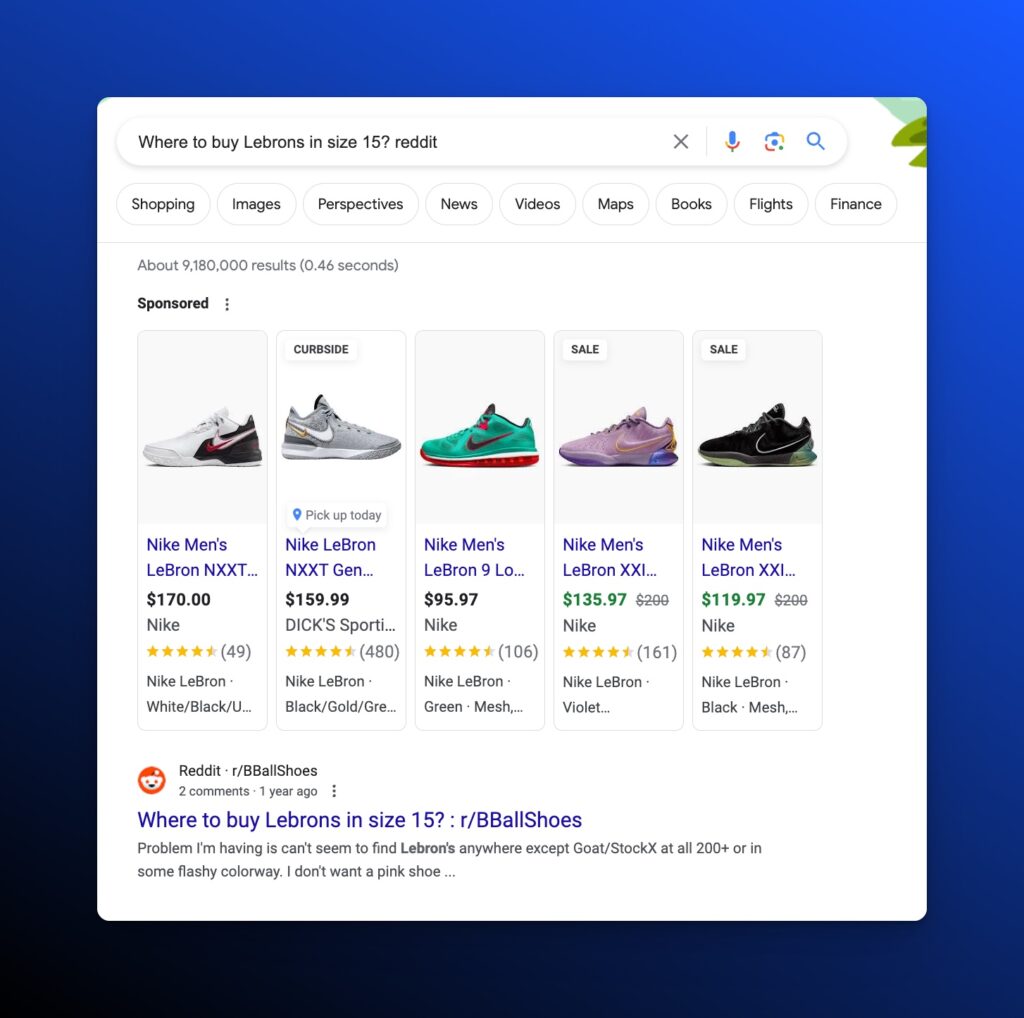 - Query Example: “Where to buy Lebrons in size 15? reddit”