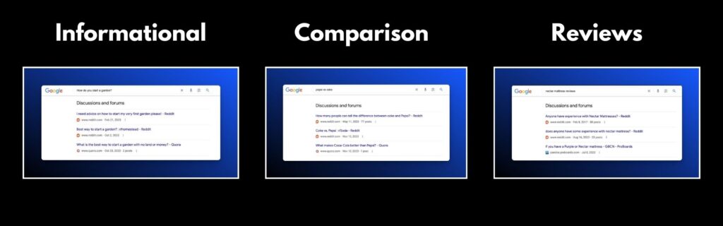 The Discussions and forums feature appears up and down the search journey everywhere from informational queries to bottom-of-the-funnel comparison and review searchers.