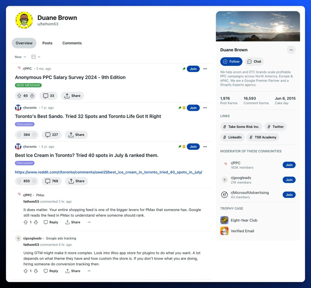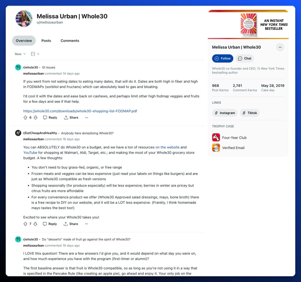 Individual contributions to Reddit at this level don’t scale easily. That’s why this strategy is a resource-intensive investment. Who are the founders and brand reps effectively building a valued presence on Reddit?