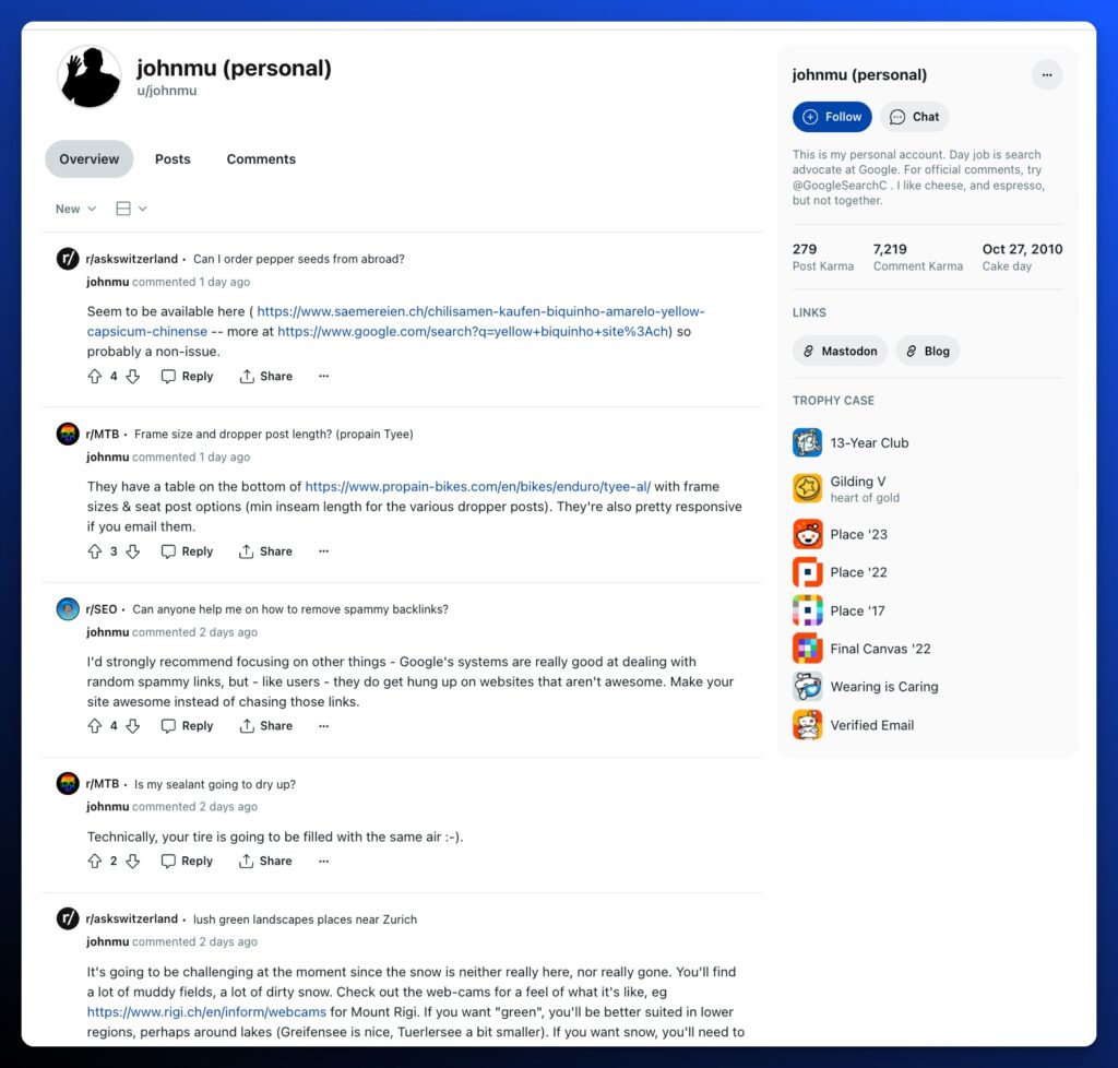 - Bio: John Mueller plays a crucial role at Google as a Search Advocate, where he connects the dots between search engineering and website optimization from Zurich, Switzerland, since 2007. His active participation in the SEO community is so notable, it’s almost as if he’s trying to rank #1 in being everywhere at once—despite his site being recently deindexed.