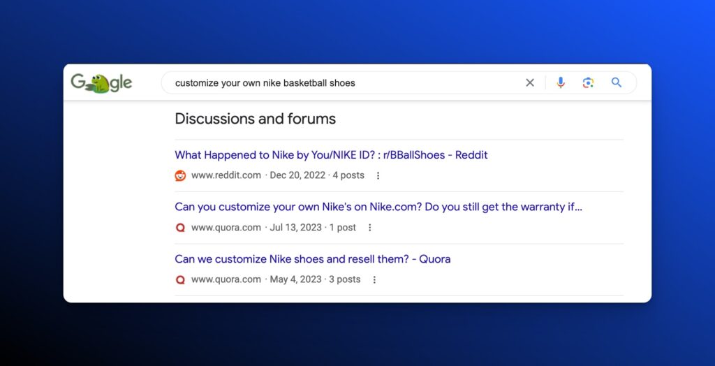 Glen Allsopp of Detailed published a study on the impact of the Discussions and forums feature on product-related queries and found that Reddit’s presence dominated the results. This feature was officially announced in September of 2022 and gained significant importance as Google focused on 1st person experience and the hidden gems.