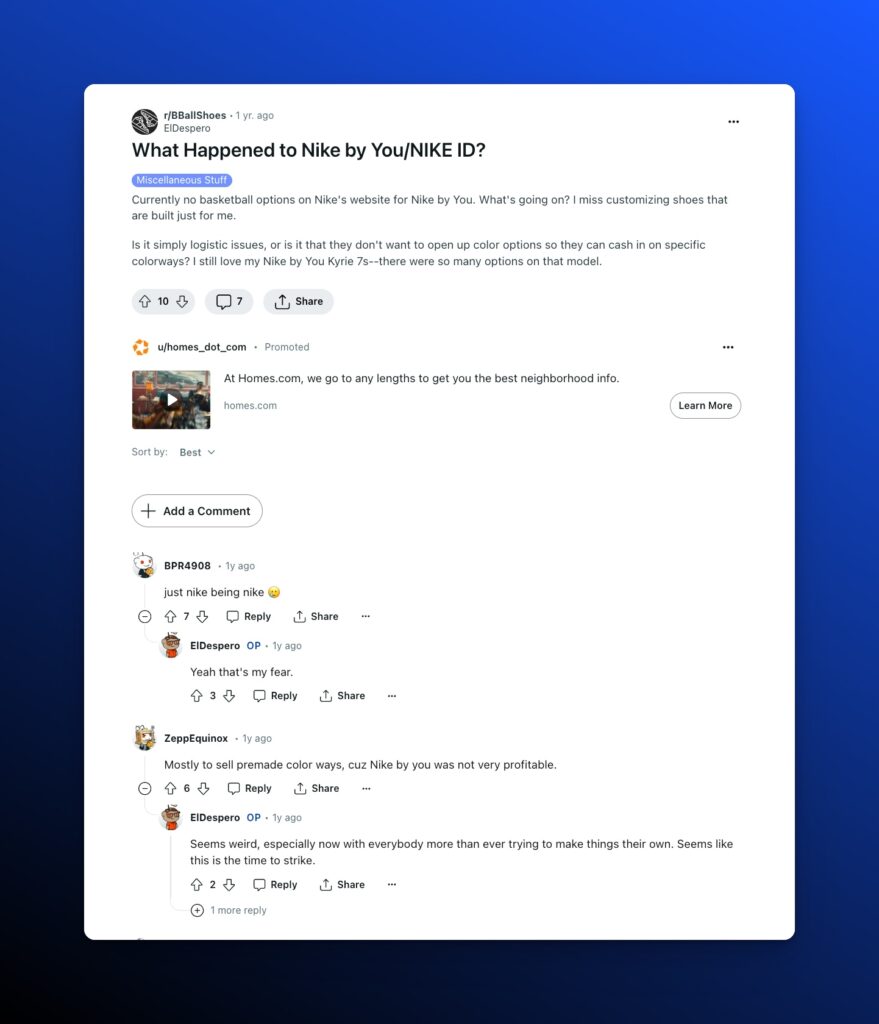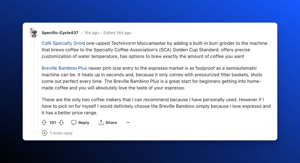 Reddit threads are valid results for consumers at every point in the buyer’s journey, from initial interest to post-purchase engagement and brand loyalty. Despite the anonymity element, for a large active community, upvoted comments serve as validated consensus. For hardcore niches, Reddit can serve as the legitimate hub and home for the pockets of the internet.