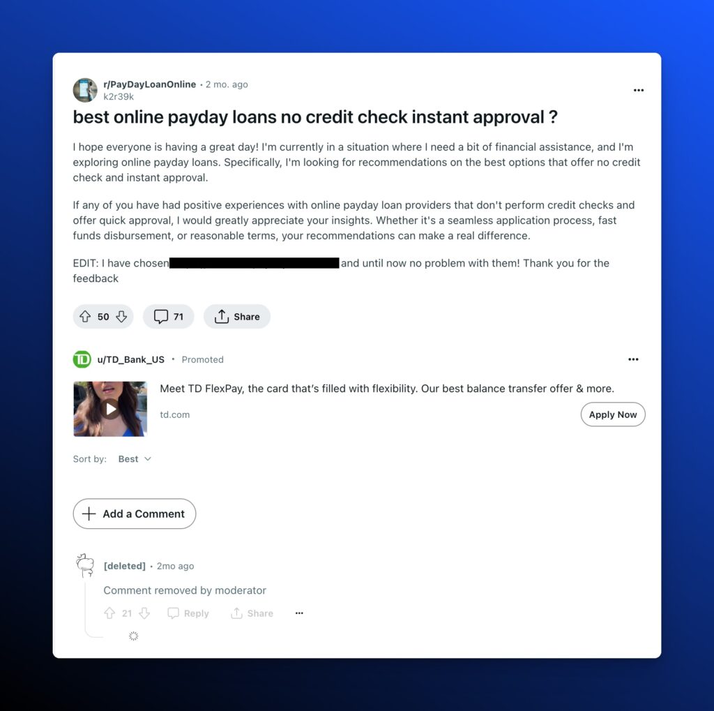 - Brand accounts or brand representatives engage in, or even initiate, threads to subtly promote their services or products, blending marketing efforts with genuine user interactions. Spam level: Somewhat shady and risky.
