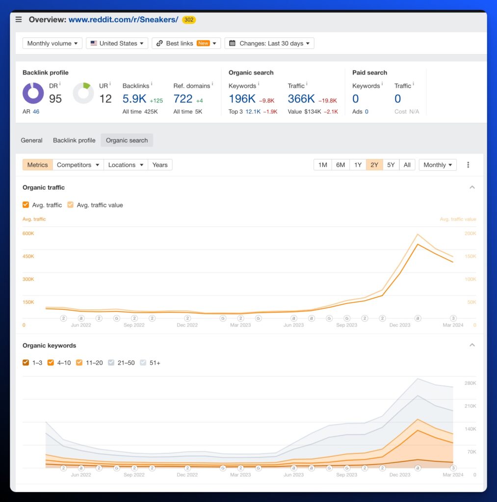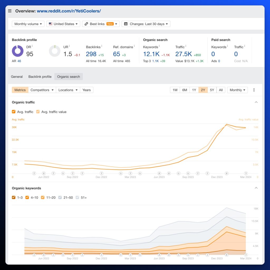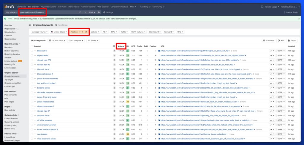 Even with the dip from February to March, you still see over 50% growth from last November. You can now reverse research the subreddit and look at where it’s ranking top 10, sorted by search volume.