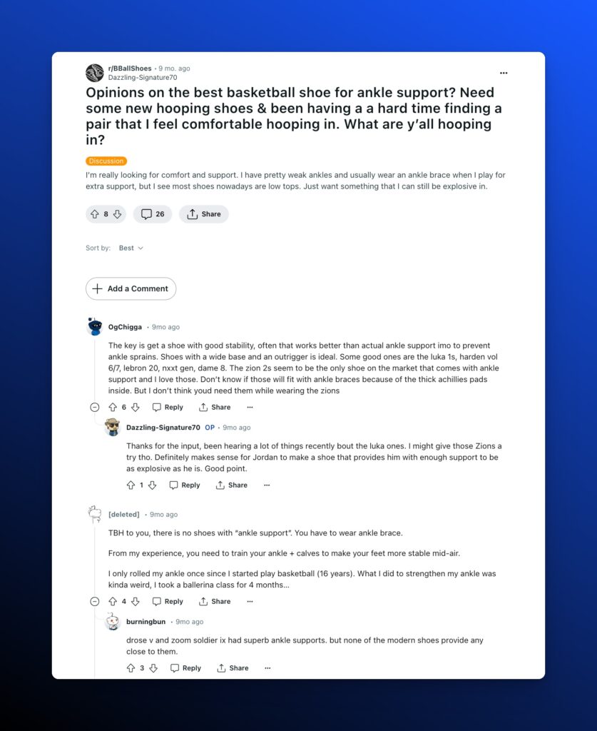 - Reddit Appearance: A thread in a basketball or sports gear subreddit discussing various basketball shoes known for their superior ankle support, highlighting user experiences and recommendations.